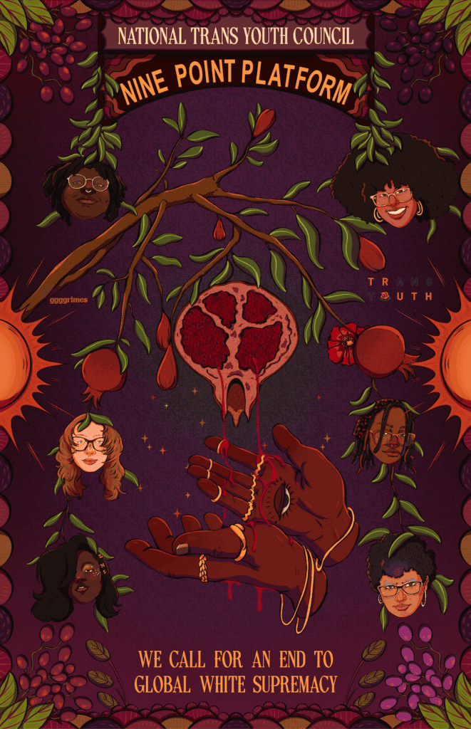 In 2018, The National Trans Youth Council (TRUTH) wrote and published their Nine-Point Platform for Liberation in order to define their revolution and achieve freedom. The manifesto is not a static document, but a living one, so that it may be updated and changed to reflect the council’s increasing understanding of the systems of oppression and the changes in the language we use to describe both ourselves and these systems. Since its creation, the platform has been used for each year’s GSA Day 4 Gender Justice Theme.